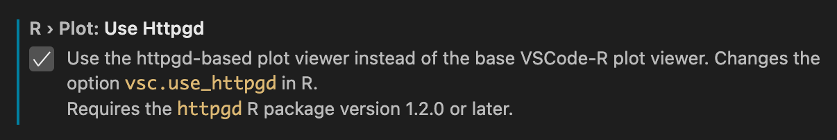 By default any R plots that you create in VS Code are rendered as a relatively low-resolution PNG and simply displayed on screen. A much better solution is to use httpgd which provides an R graphics device that can be accessed in a web browser. This enables similar functionality in VS Code to the plot window in RStudio where plots can be resized, zoomed, and exported. The R extension for VS Code has support for httpgd built in so after installing the httpgd R package, you just need to enable it in the settings for the R extension: