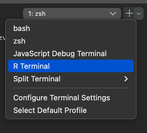 VS Code has an integrated terminal where the R session runs. However, as I learned the hard way, don’t launch R by typing R from a terminal prompt in VS Code. This will launch R, but it won’t be able to communicate with VS Code properly. Instead you need to click the down arrow next to the plus button used to open a new terminal, and select R Terminal.