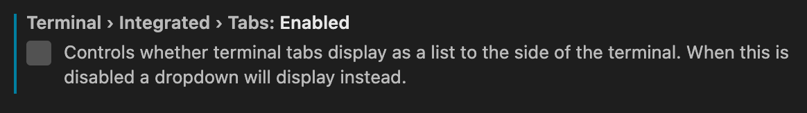 Terminal tabs are shown in a list on the right side of the screen which I think wastes some horizontal space. There’s a setting to put these in a dropdown menu instead: