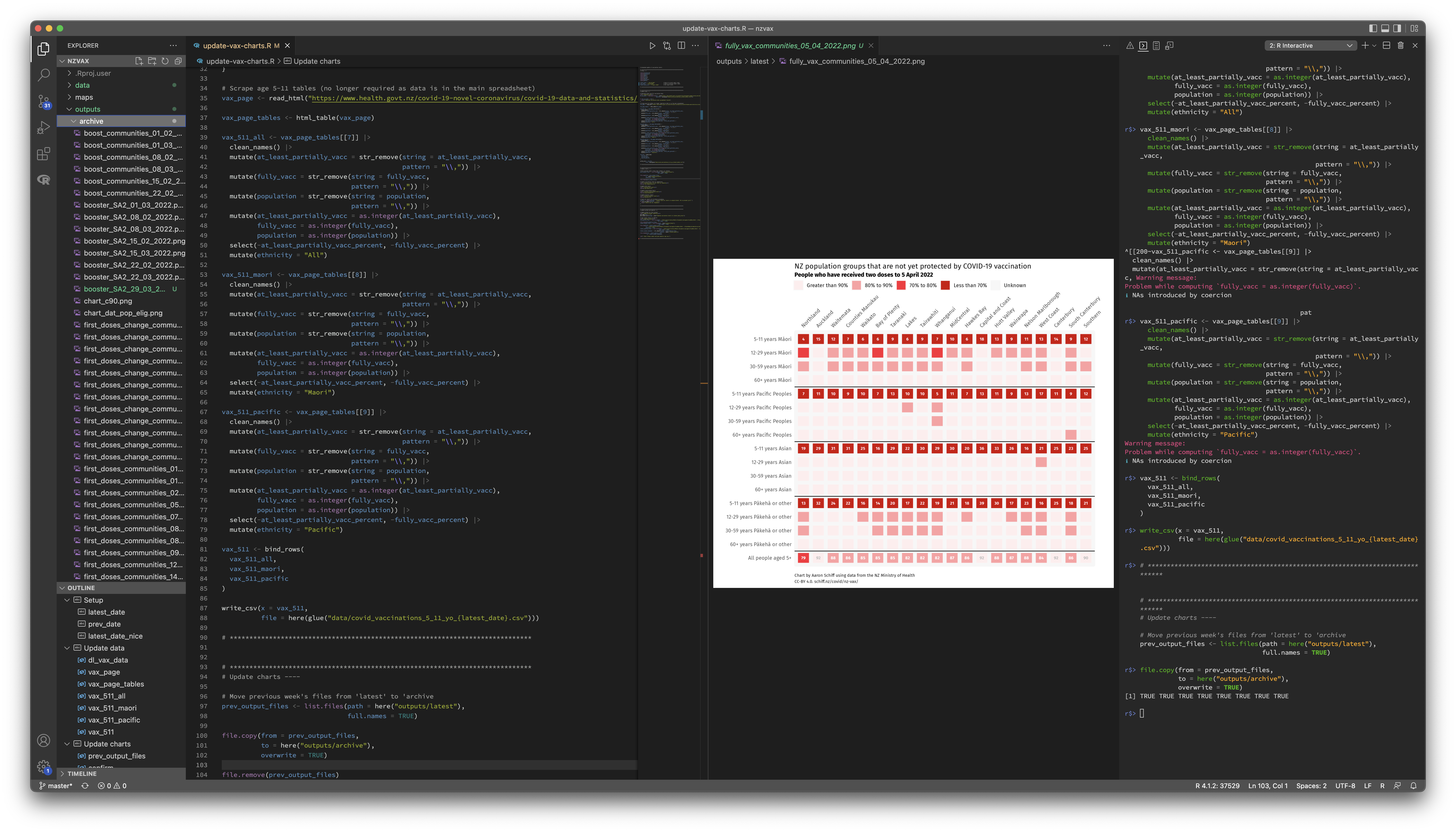Next from the left is a code pane, and to the right of that is a chart that has been output as a PNG file by the code. I often make charts as output so it’s nice to be able to preview these directly in VS Code. Then at the far right is the terminal pane which is showing an R console and can also be used as a command-line terminal. All of the layout is very customisable and you can also have a horizontal pane at the bottom of the screen if you wish.