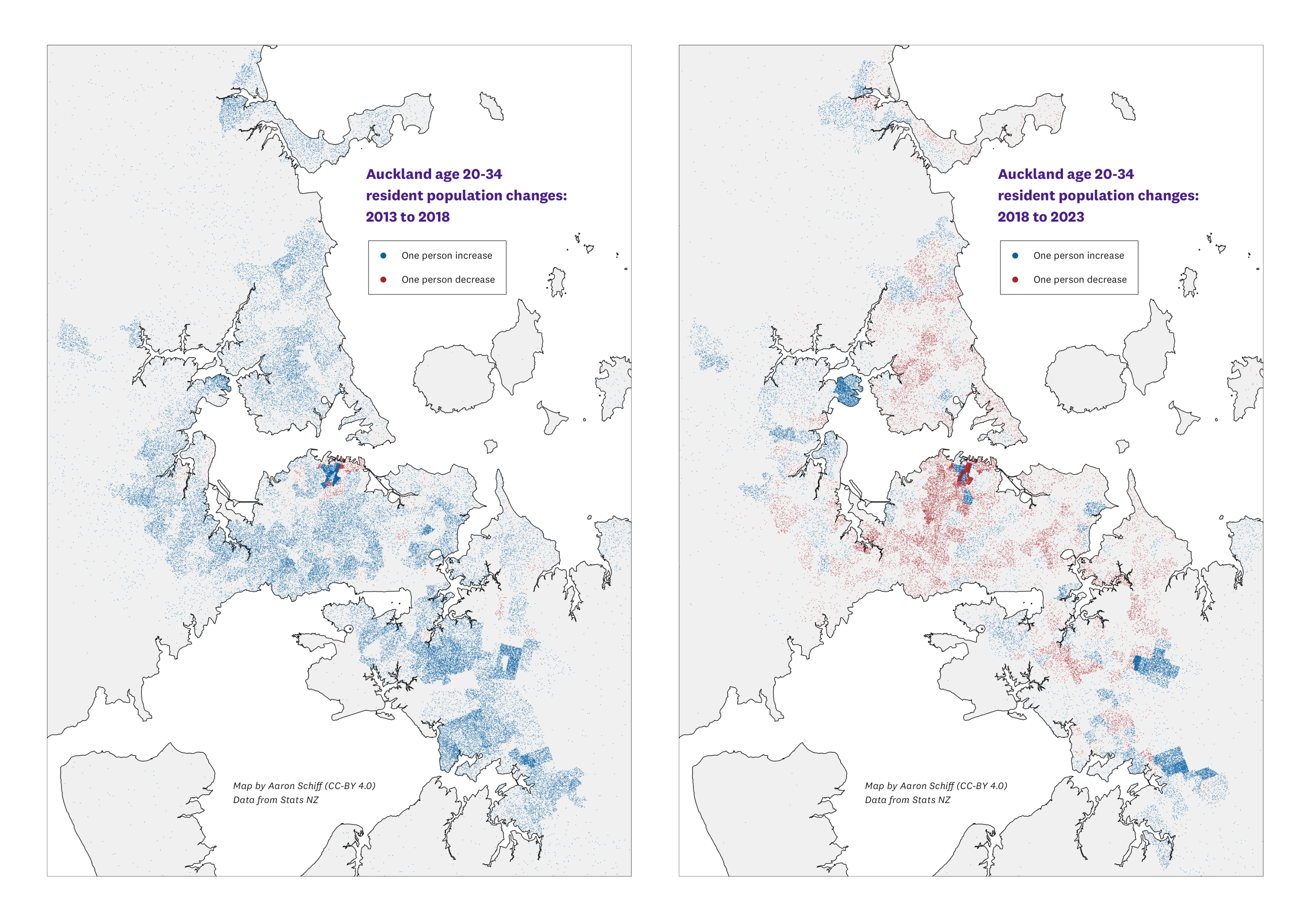 After previous New Zealand Census, I made a dot-density map of changes in the resident population of “youngish adults” in Auckland – people aged 20 to 34 years old.
