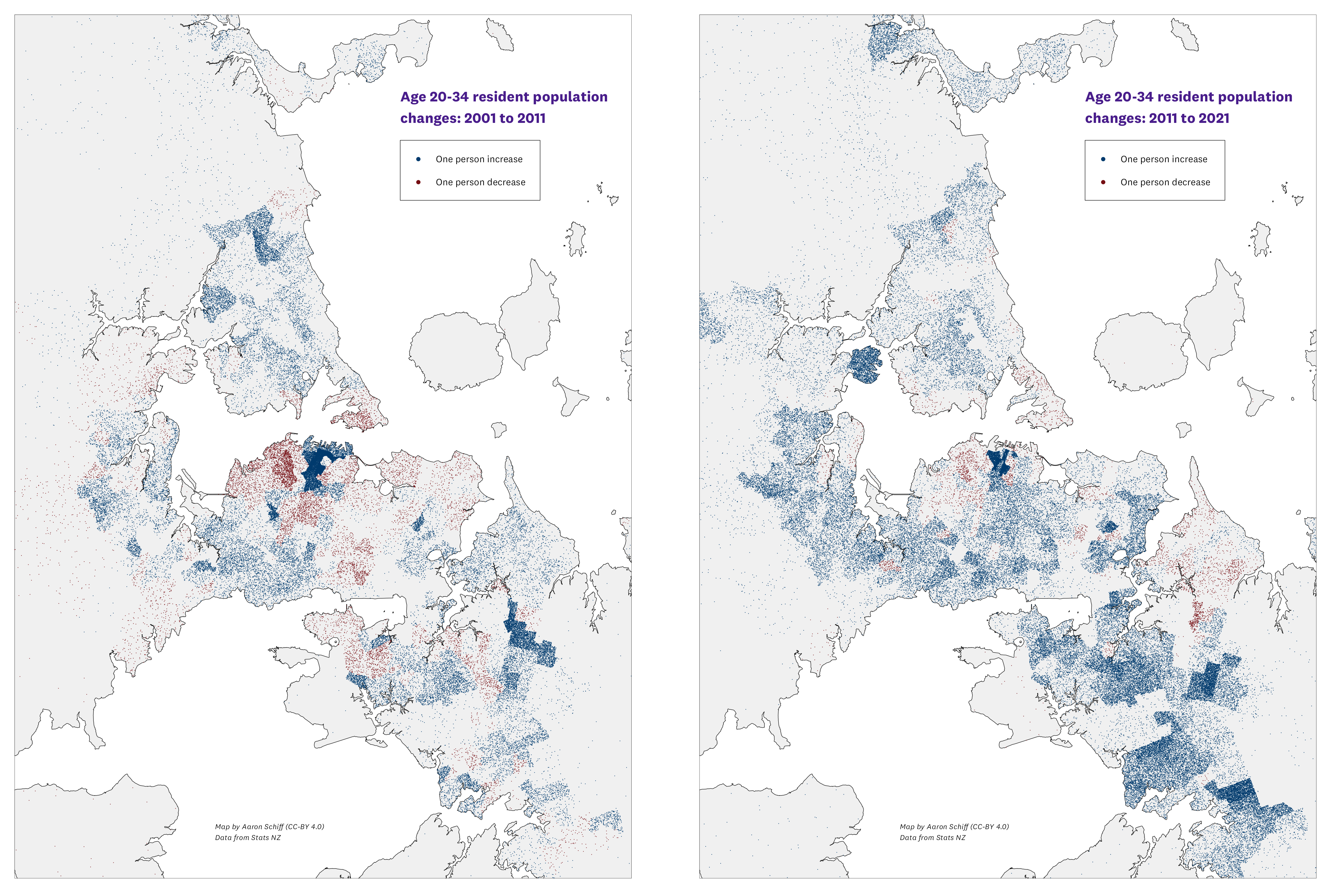 For 2011 to 2021, the CBD is still dark blue, but in a smaller area. Some of the areas around the CBD have stayed red, although with fewer dots, possibly because most people aged 20 to 34 have already been priced out of these areas. But some of the areas just to the east and south of the CBD that were red between 2001 and 2011 turned blue between 2011 and 2021. This could reflect Auckland’s Unitary Plan opening up more land for redevelopment in those areas than was previously possible.